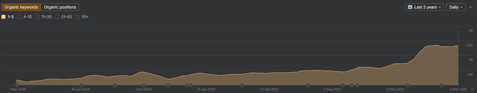Кількість ключових слів у Топ 1-3 суттєво зросла. Органічний трафік показав стабільний висхідний тренд без різких просадок.